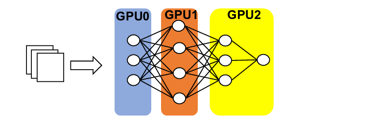 Each GPU is responsible for computing a different part of the model.